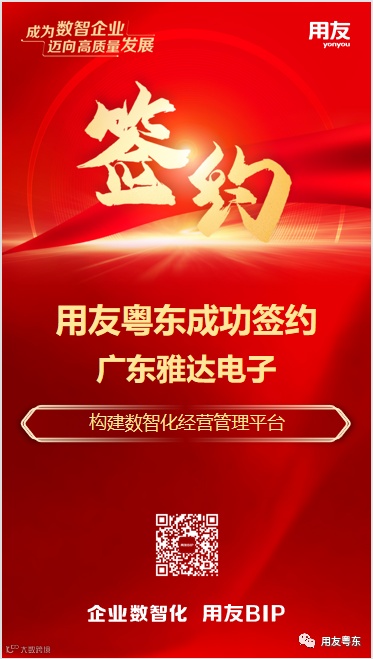 近日,广东雅达电子股份有限公司(以下简称“广东雅达”)与用友粤东分公司签约,基于用友打造的数智化经营管理平台。通过平台建设,广东雅达将全面提升客户经营效率与服务能力,推进数智化转型,迈向高质量发展。