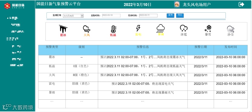总之,随着新能源行业发展及精度要求的逐步增高,异常气象预警问题是绕不开的话题,如近年冬春涉及湖南、贵州、广西等南方地区因覆冰造成的风机停机情况较多,华北、西北等地区的大风、低温、沙尘气象情况也较多,大范围的异常天气会直接影响到全网新能源场站运行和出力。