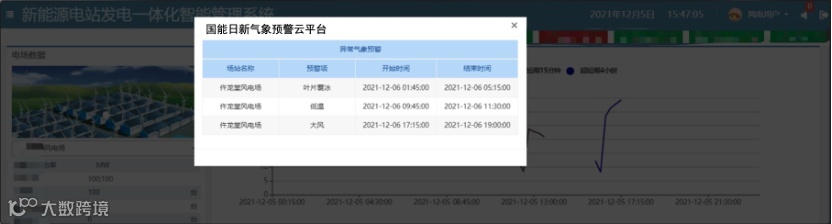 电站标配的功率预测系统采用的数值气象预报数据较为平缓,很难预报出大风、低温等短时气象数据、而对于能够影响辐照度的多云、沙尘、雾霾、降雪等异常天气状态,也没有相应参数的直接预报结果。所以,针对异常天气多发地区的风光场站,在出现此类气象条件造成风机切出、光伏实际出力和预测偏差过大等问题时,将直接影响新能源场站发电效率,及影响电网安全稳定运行的故障隐患。