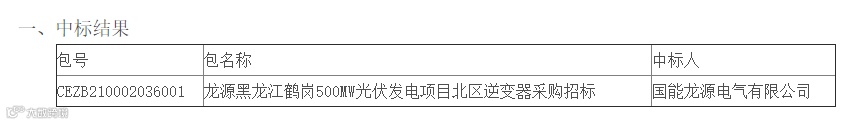 龙源电力黑龙江鹤岗500MW光伏发电项目北区逆变器采购的中标结果公告,国能龙源电气有限公司中标。