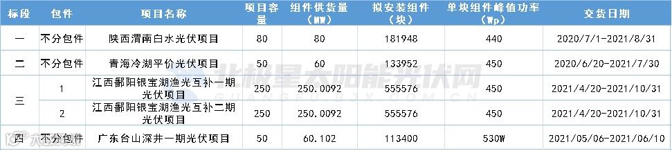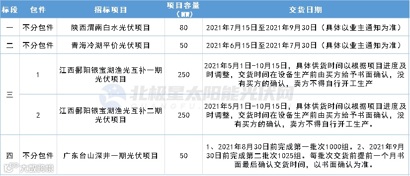 4月5日,中广核新能源发布680MW光伏项目组件、逆变器、光伏支架集采招标公告。此项目共分为4个标段,标段一为陕西渭南白水80MW光伏项目 ;标段二青海冷湖50MW平价光伏项目;标段三分为两个包件,包件1为江西鄱阳银宝湖渔光互补一期250MW光伏项目,包件2为江西鄱阳银宝湖渔光互补二期250MW光伏项目;标段四为广东台山深井一期50MW光伏项目。根据招标文件,光伏组件招标总量约700MW,招标文件递交截止时间为2021年04月25日。