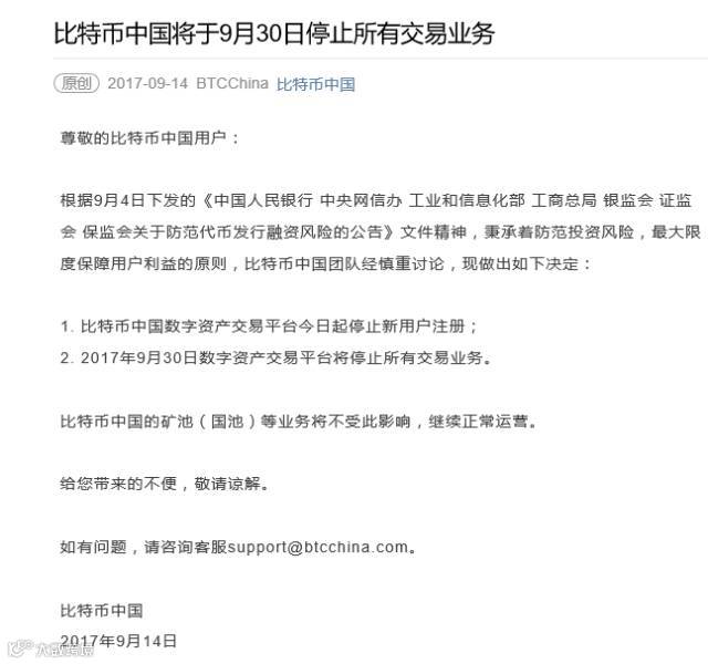 14日晚间,比特币中国发布公告称,根据9月4日七部门出台的《关于防范代币发行融资风险的公告》文件精神,秉承着防范投资风险,最大限度保障用户利益的原则,比特币中国团队决定:14日起停止比特币中国数字资产交易平台新用户注册;2017年9月30日数字资产交易平台将停止所有交易业务。比特币中国的矿池(国池)等业务将不受此影响,继续正常运营。