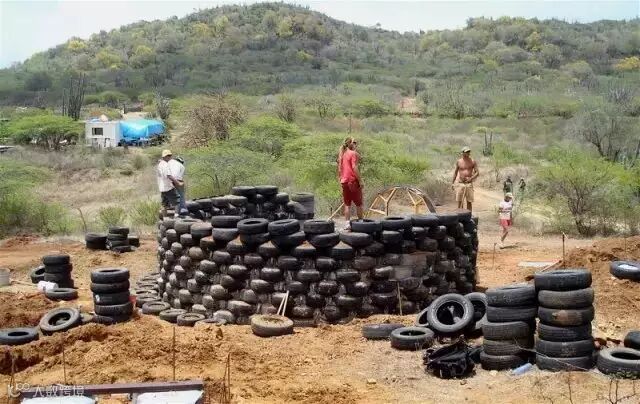 全部都用轮胎垒砌,延伸至地面做墙,