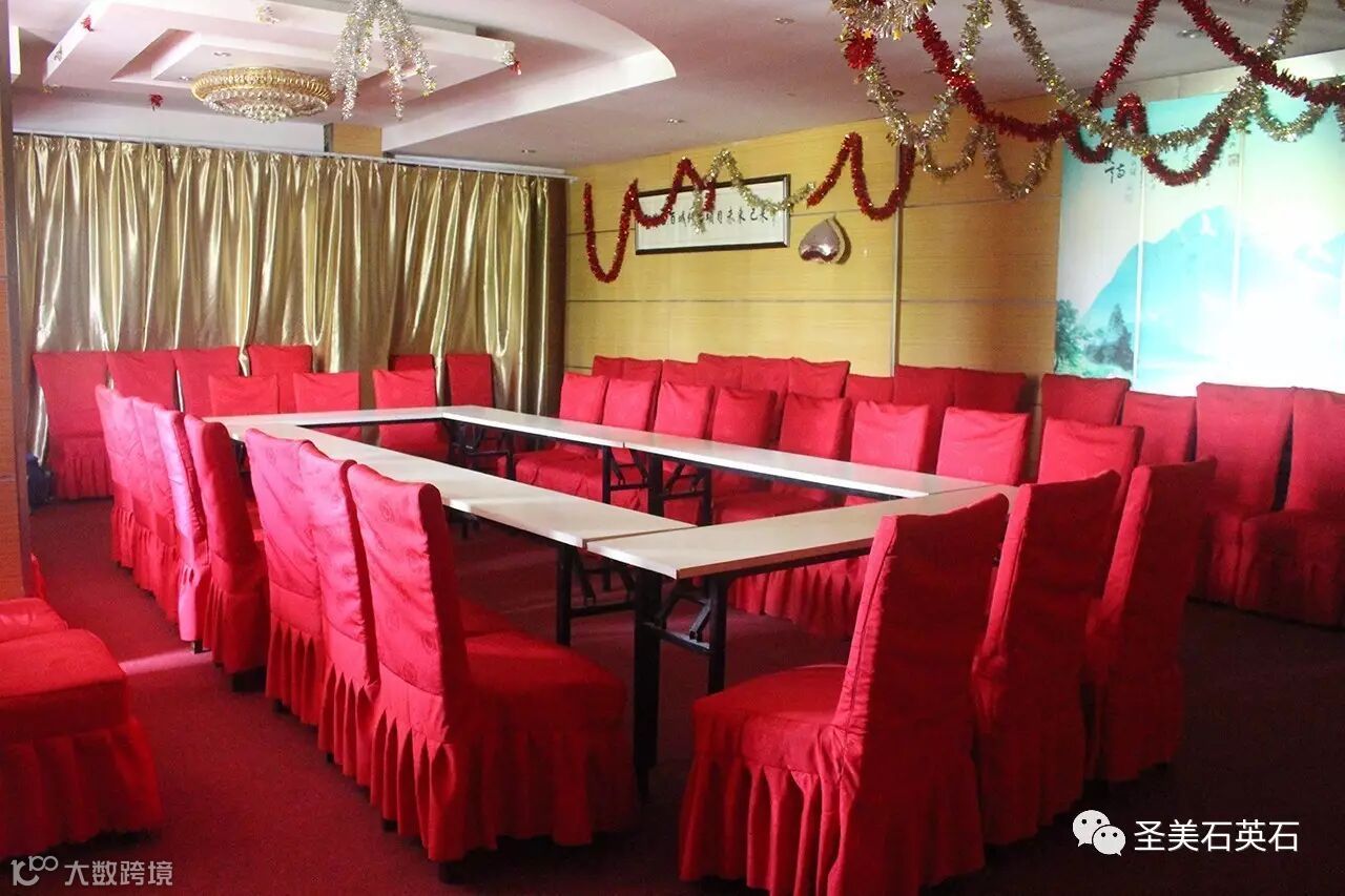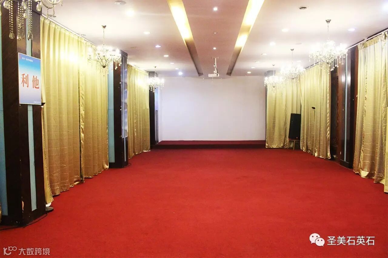 会议室主要以红色色调为主,两边悬挂着金色的窗帘,地面铺设着纹路整齐的地毯,天花板上并列着几盏晶莹透明的水晶灯。鲜明的主色彩彰显出热情洋溢的氛围,整齐摆放的桌椅凸显了会议时严谨的态度。