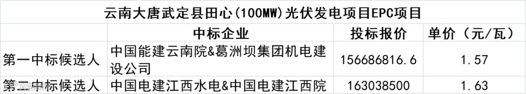 5月14日,云南大唐武定县田心100MW光伏发电项目EPC总承包公示中标候选人,中国能建云南院与葛洲坝集团机电建设公司联合以1.12元/瓦的单价预中标,江西院单价1.17,中标公示如下: