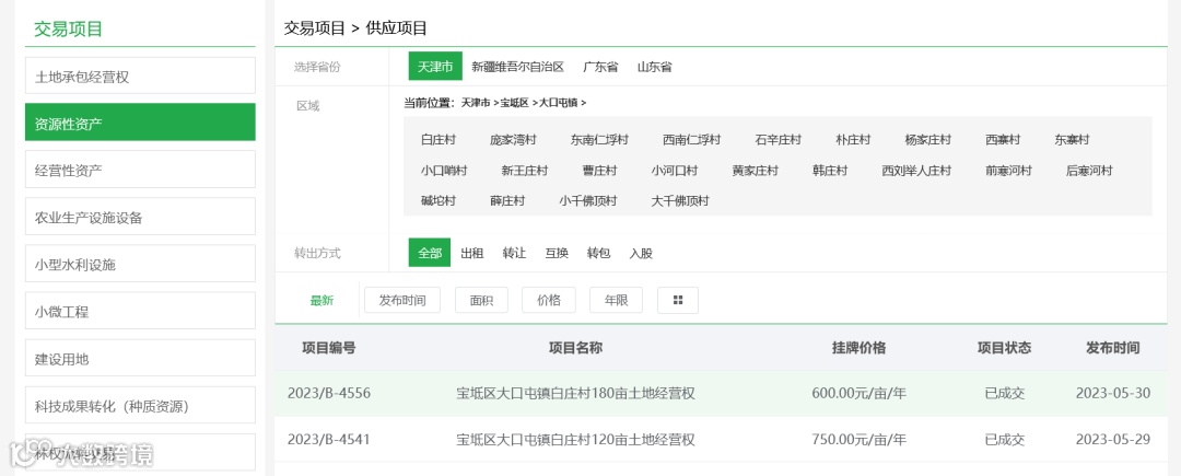 2023年6月初,宝坻区大口屯镇白庄村300亩耕地在天津农村产权交易所顺利流转,流转期4年,成交总金额125.28万元,溢价率58.18%,为村集体增收46.08万元。