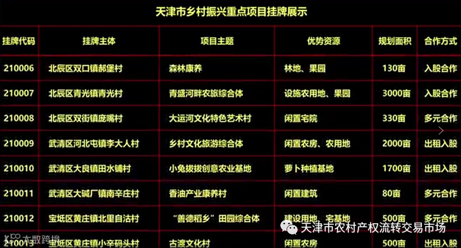 “十四五”时期,天津市将推出100个乡村振兴示范村,集中优势资金、资源、政策,推动示范村做强做优,带动全市乡村发展水平全面提升。此次从100个示范村中精选了24个整体发展较快、资源条件优越、发展前景较好的项目,做为重点招商引资项目。欢迎社会各界有志于乡村振兴事业、有投资乡村意向的朋友前来洽谈合作,把握乡村振兴机遇,实现互利合作共赢。