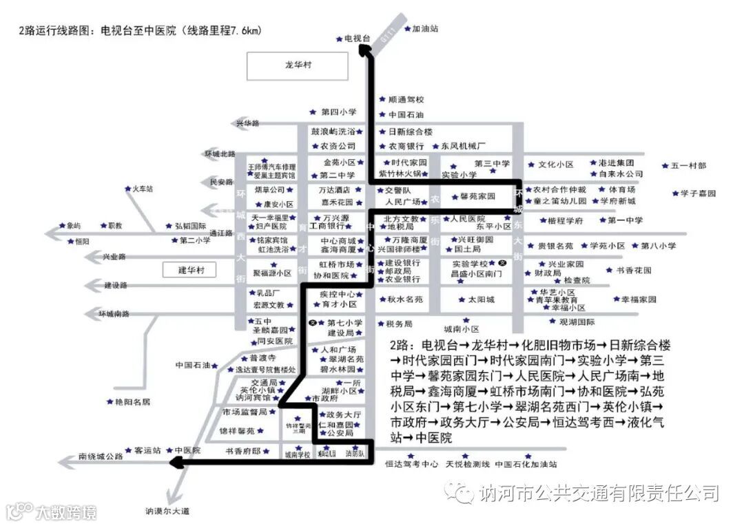 2路:电视台→龙华村→化肥旧物市场→日新综合楼→时代家园西门→时代家园南门→实验小学→第三中学→馨苑家园东门→人民医院→人民广场南→地税局→鑫海商厦→虹桥市场南门→协和医院→弘苑小区东门→第七小学→翠湖名苑西门→英伦小镇→市政府→政务大厅→公安局→恒达驾考西→液化气站→中医院