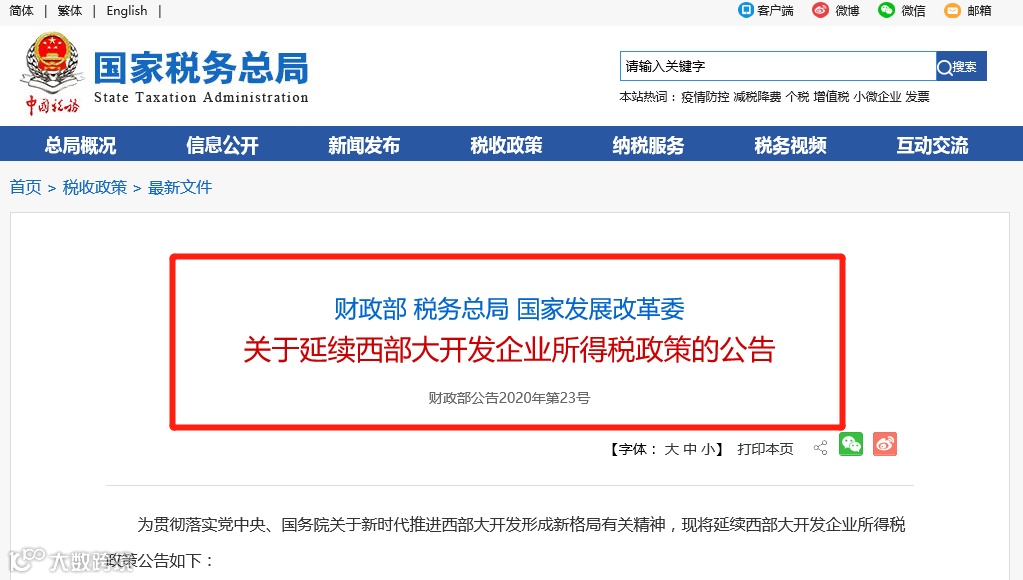财政部、税务总局、国家发展改革委联合发布的《关于延续西部大开发企业所得税政策的公告》(财政部公告2020年第23号),主要内容如下: