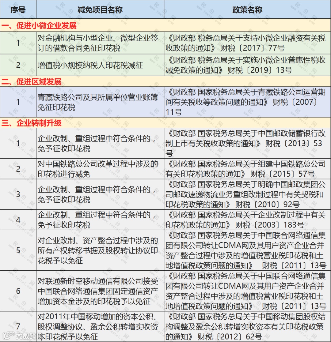 根据总局发布的最新减免政策,我们整理了印花税减免税优惠项目70个。为方便小主们记忆,特将上述优惠项目分为了8类,具体分类情况如下: