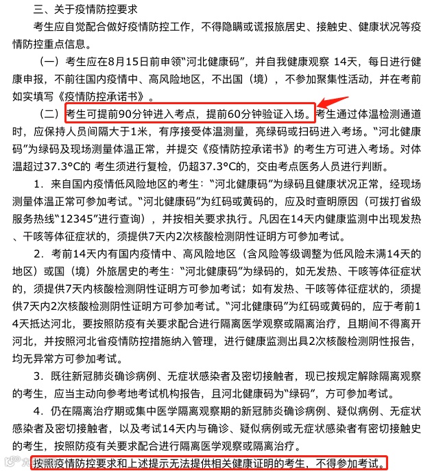 河北早在7月24日就发布了疫情防控的相关要求安排,就到场时间、体温等做出了具体要求!