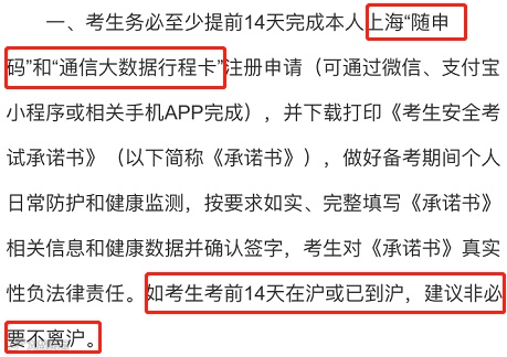 (四)上海:提前14天申请上海“随申码”和“通信大数据行程卡”+《承诺书》签字确认+至少提前60分钟到达考点+体温查验<37.3℃……