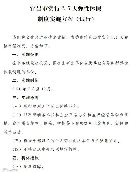 7月20日,据宜昌发布微信公号。湖北宜昌市人民政府办公室印发《宜昌市实行2.5天弹性休假制度实施方案(试行)》的通知。
