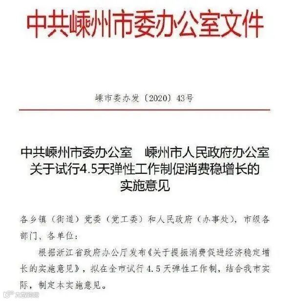 前段时间,“嵊(shèng)州发布”官号推送市委办、市府办下发的——《关于试行4.5天弹性工作制促消费稳增长的实施意见》。