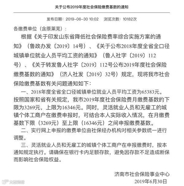 近日,济南市事业保险中心发布《关于公布2019年度社会保险缴费基数的通知》,据记者了解,从7月1日起,济南市开始下调2019年度社会保险缴费基数上下线及缴费标准。社会保险费月缴费基数的下限为3269元,上线为16342元,同2018年度相比下降约6.8%。