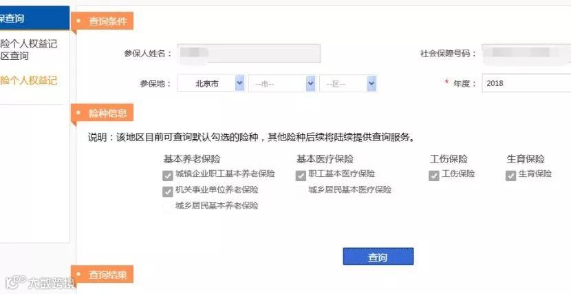 4.参保地、年度选择以后,平台就会自动显示,该地区该年度可查询的险种类型,点击查询就能查到自己的个人权益记录单啦~