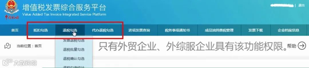 ④外综服企业在平台上具有代办退税勾选功能,该功能只适用于有代办退税标识的增值税专用发票。代办退税勾选功能勾选即确认,且不可撤销。
