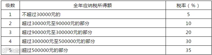 3.经营所得,以每一纳税年度的收入总额减除成本、费用以及损失后的余额,为应纳税所得额,适用百分之五至百分之三十五的超额累进税率。(详见个人所得税税率表二)