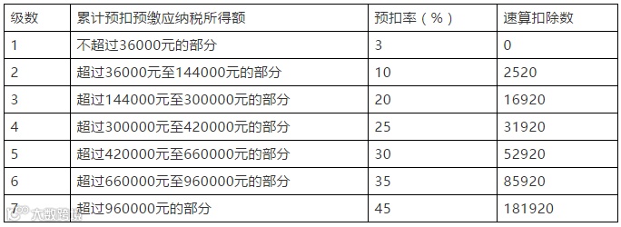 1.居民个人的综合所得,以每一纳税年度的收入额减除费用六万元以及专项扣除、专项附加扣除和依法确定的其他扣除后的余额,为应纳税所得额,适用百分之三至百分之四十五的超额累进税率(详见个人所得税税率表一)。