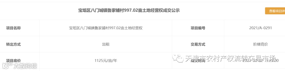 2021年年初,鲁家铺村59户村民委托村集体经济组织将承包地共计997.02亩统一对外流转。经村集体经济组织民主决策,一致同意将承包地纳入天津农交所平台面向社会公开流转,挂牌底价1125元/亩/年。22日下午,项目竞价通道开启后,经过35分钟、14轮报价,该片土地最终以1305元/亩/年的价格成交,溢价率16%。