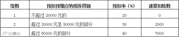 劳务报酬所得、稿酬所得、特许权使用费所得,以每次收入额为预扣预缴应纳税所得额,计算应预扣预缴税额。稿酬所得、特许权使用费所得适用百分之二十的比例预扣率。劳务报酬所得适用下表计算: