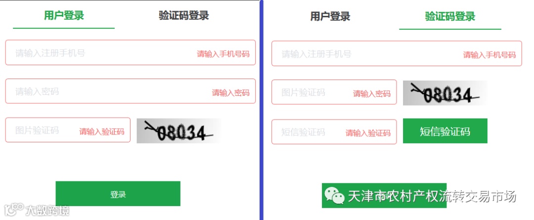 如果您是已注册用户,点击左侧登录键,进入登录页面。通过“用户登录”,输入手机号、密码、验证码登录系统。或通过“验证码登录”,输入手机号、图片验证码、点击短信验证码按钮将收到的短信验证码输入到对应框中后登录。