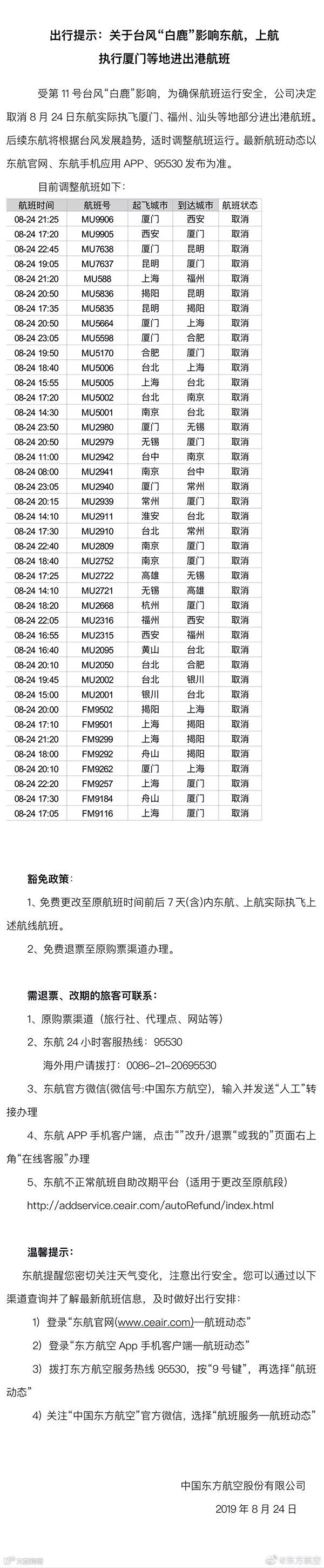 受“白鹿”影响,为确保航班运行安全,8月24日东航实际执飞厦门福州、汕头等地部分进出港航班取消。旅客可免费更改至原航班时间前后7天(含)内东航、上航实际执飞上述航线航班。可至原购票渠道办理免费退票。