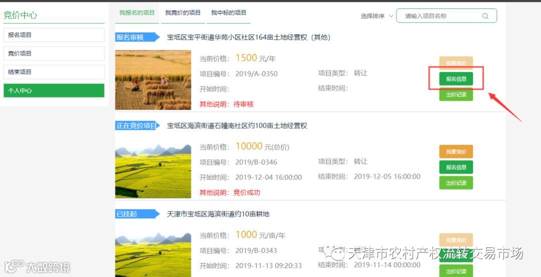 第二步>>>>用户注册成功后,在农交所官网点击“天津市农村产权流转交易竞价报名系统”,进入竞价中心。