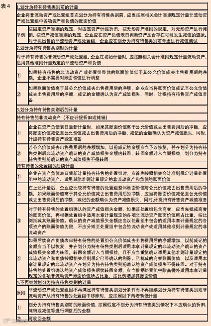 对于持有待售的处置组的计量,只要处置组中包含了适用本章计量规定的非流动资产,就应当采用下文所述的方法计量整个处置组。处置组中的流动资产和适用其他准则计量规定的非流动资产和所有负债的计量适用相关会计准则(见表4)。