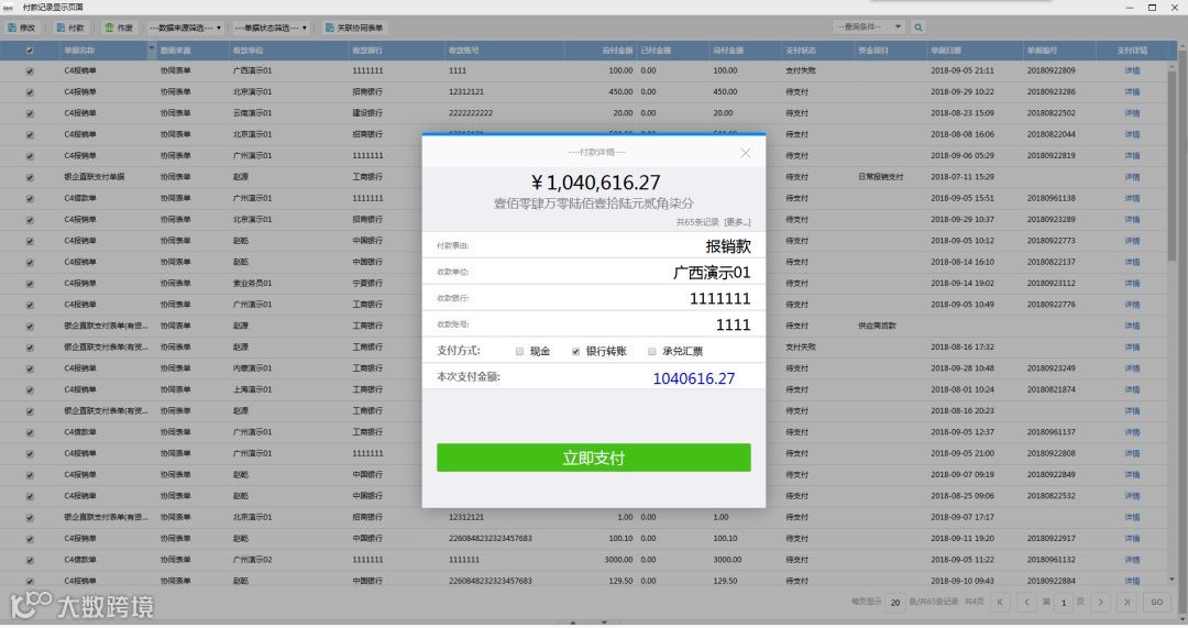 财务核算的数据根据流程推送到支付平台,出纳根据实际情况可以完成一键支付,费用报销支付瞬间完成,整体效率提升数十倍。