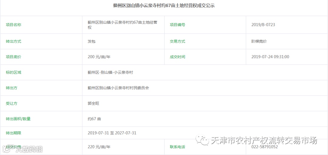 7月24日上午,蓟州区别山镇小云泉寺村约67亩土地经营权在天津农交所成功流转。该项目转出方为蓟州区别山镇小云泉寺村村民委员会,受让方为种植大户。项目挂牌底价为200元/亩/年,成交价格为220元/亩/年,溢价率10%。