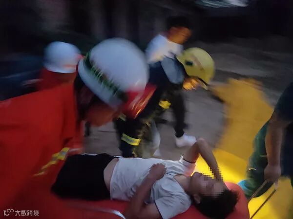 被困男子躺在担架上被紧急送医 本文图均为 周口市消防救援支队 图