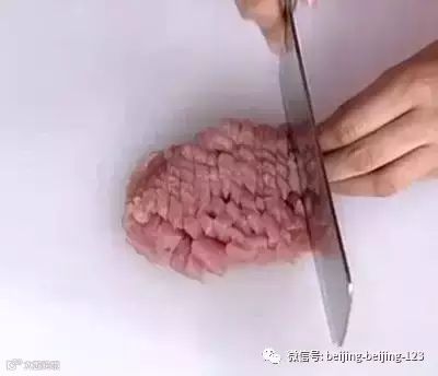 把猪肉放到案板上,刀斜45度切肉,注意不要把肉切断,然后原地翻面,再斜着切。正反切过45度后,再直直90度下刀,切两面,这种的切法让你不费力剁猪肉,直接切成末。