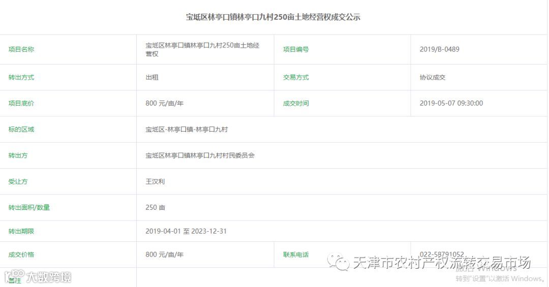 5月7日上午,宝坻区林亭口镇林亭口九村250亩土地经营权在天津农交所顺利流转。该项目转出方为宝坻区林亭口镇林亭口九村村民委员会,受让方为种植大户,成交价格为800 元/亩/年。