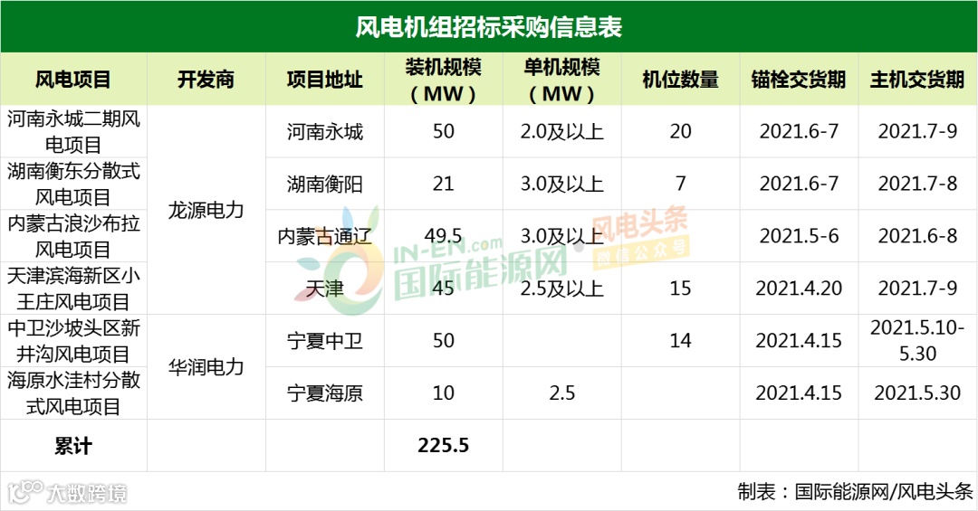 近日,龙源电力、华润电力陆续发布6个风电机组招标采购公告,项目累计装机为225.5MW。