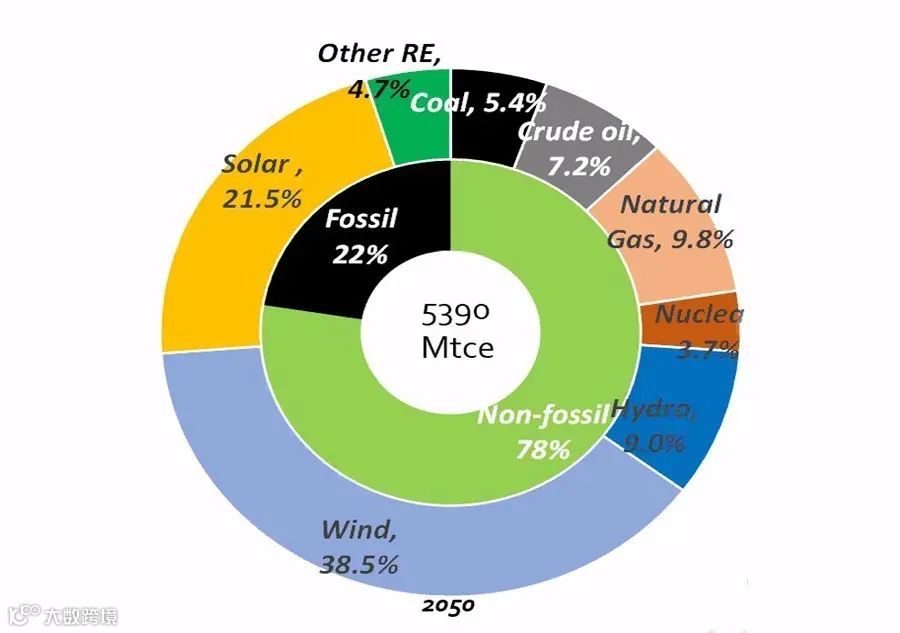 根据《2020年中国可再生能源展望报告》,为了实现《巴黎协定》将全球温度升高控制在2摄氏度以下的目标。中国非化石能源比重未来会持续高速增长,十四五达到25%,十五五达到34%,十六五达到42%。最终到2050年,中国非化石能源比重将提升至78%,煤炭消费相比2019年下降90%,二氧化碳排放相比2019年下降76%。到2050年,中国风电将占到能源消费的38.5%,光伏占到21.5%,排在之后的是天然气占9.8%,水电占9%。CWEA