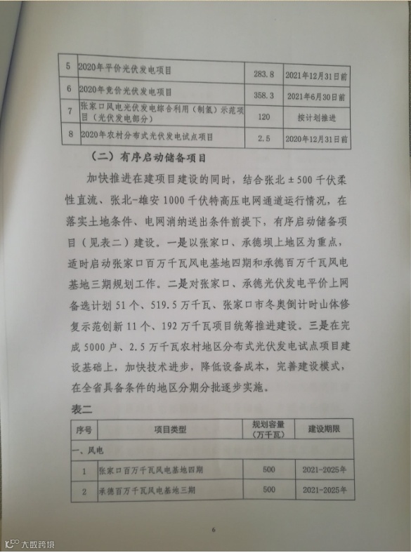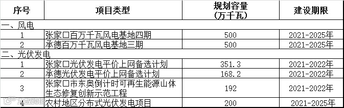 二、有序启动储备项目(见表二)。一是以张家口、承德坝上地区为重点,适时启动张家口百万千瓦风电基地四期和承德百万千瓦风电基地三期规划项目。二是对张家口、承德光伏发电平价上网备选计划51个、519.5万千瓦、张家口市冬奥倒计时山体修复示范创新11个、192万千瓦项目统筹推进。三是在完成5000户、2.5万千瓦农村地区分布式光伏发电试点项目建设基础上,加快技术进步,降低设备成本,完善建设模式,在全省具备条件的地区分期分批逐步实施。
