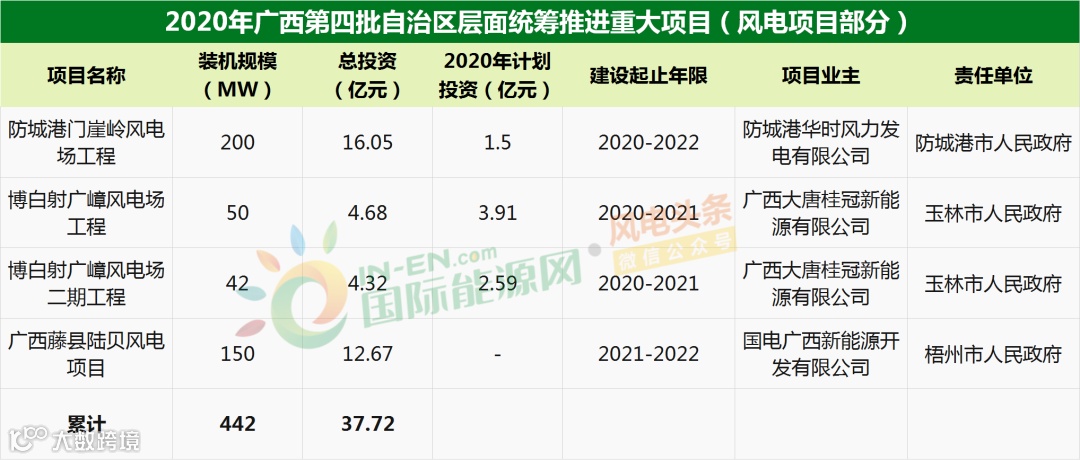 据国际能源网/风电头条(微信号:wind-2005s)统计,项目中包括3个已开工风电项目和1个预备开工风电项目,累计装机规模达到442MW,累计投资金额为37.72亿元。