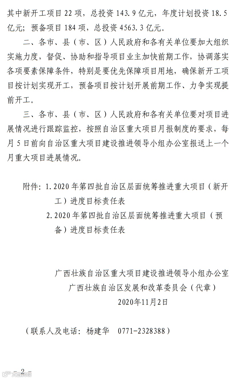 近日广西壮族自治区重大项目建设推进领导小组办公室下达《2020年第四批自治区层面统筹推进重大项目计划》的通知。