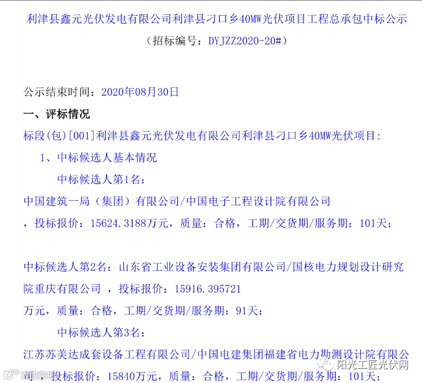利津县鑫元光伏发电有限公司利津县刁口乡40MW光伏项目工程总承包中标公示