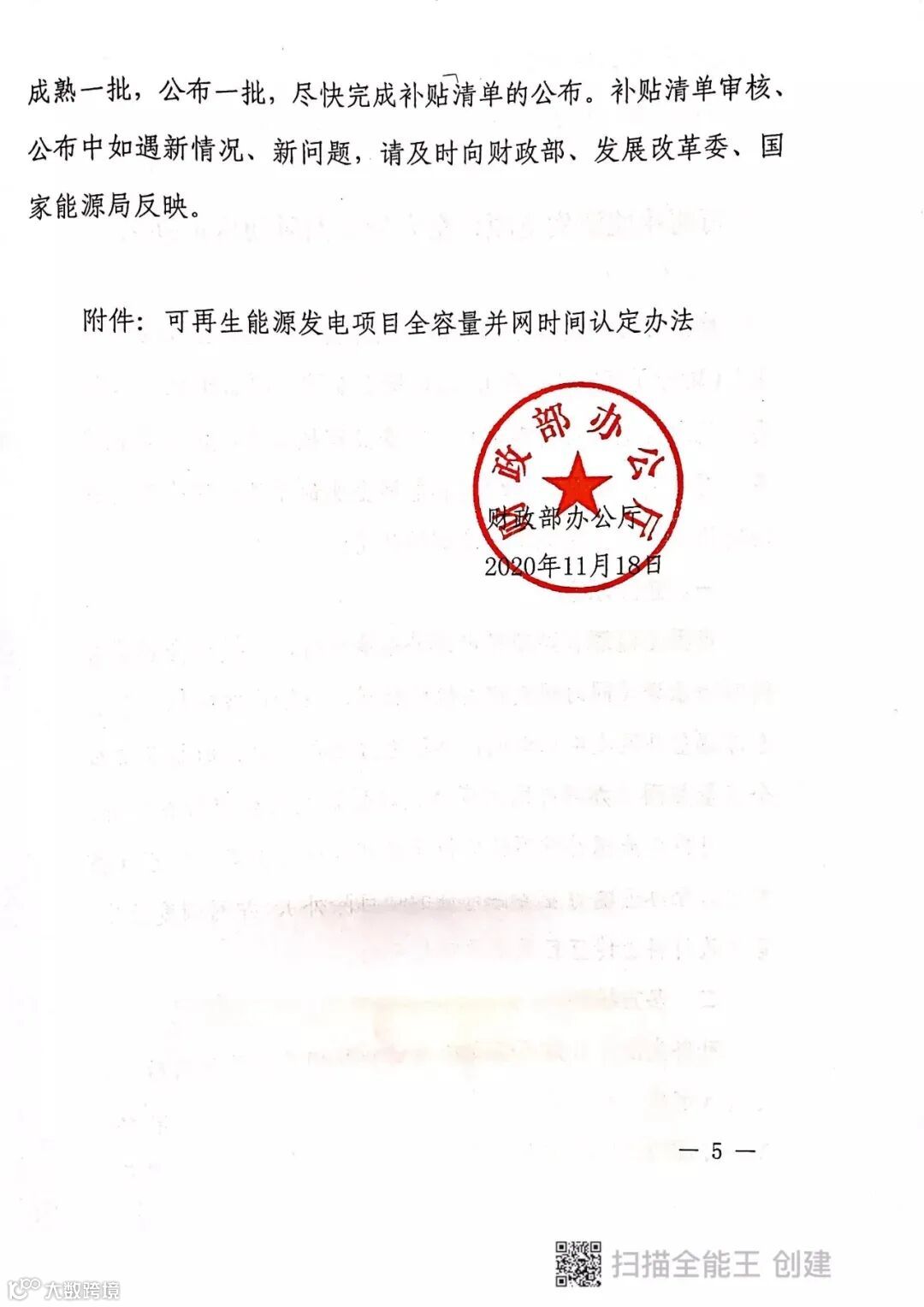 此外,财政部还同步下发了《可再生能源发电项目全容量并网时间认定办法》,明确了地方能源监管机构负责审核电力业务许可证的真实性和有效性;电网企业负责审核并网调度协议的真实性和有效性;可再生能源信息管理中心负责审核全容量并网时间承诺书和相关证明材料的完整性、逻辑性。