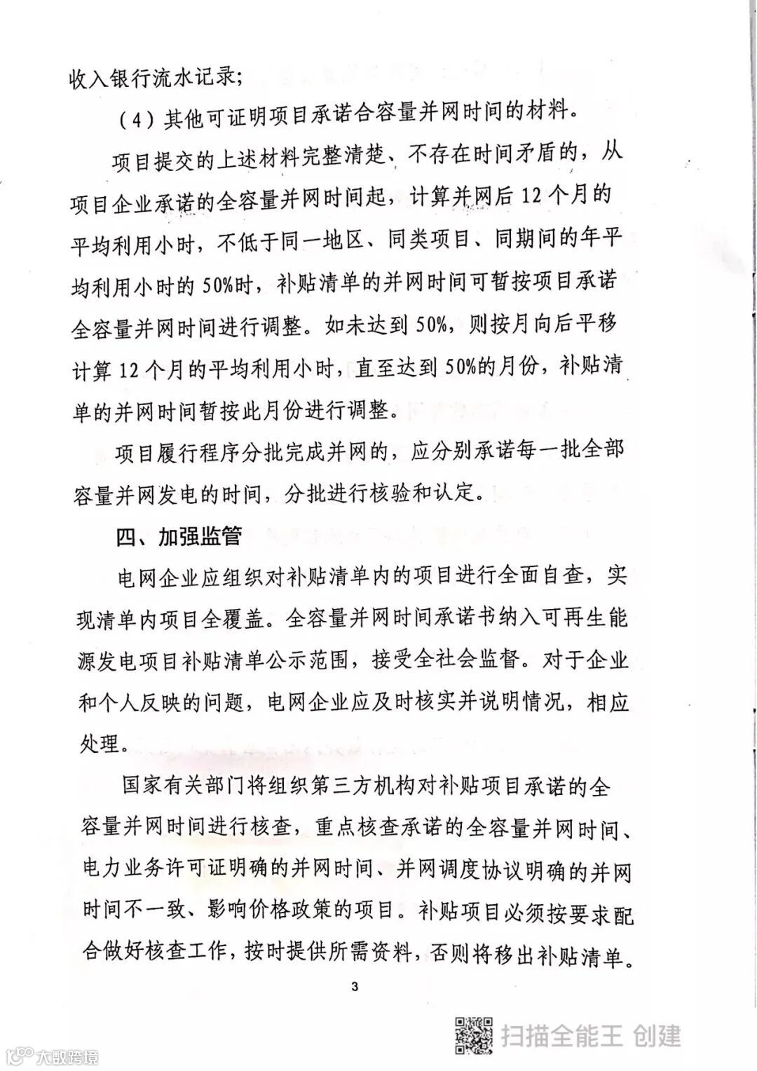《办法》还提出,可再生能源补贴项目承诺的全容量并网时间、电力业务许可证明确的并网时间、并网调度协议明确的并网时间不一致,且影响电价政策的,按照三个并网时间中的最后时点确认全容量并网时间,列入补贴清单,享受对应的电价政策。