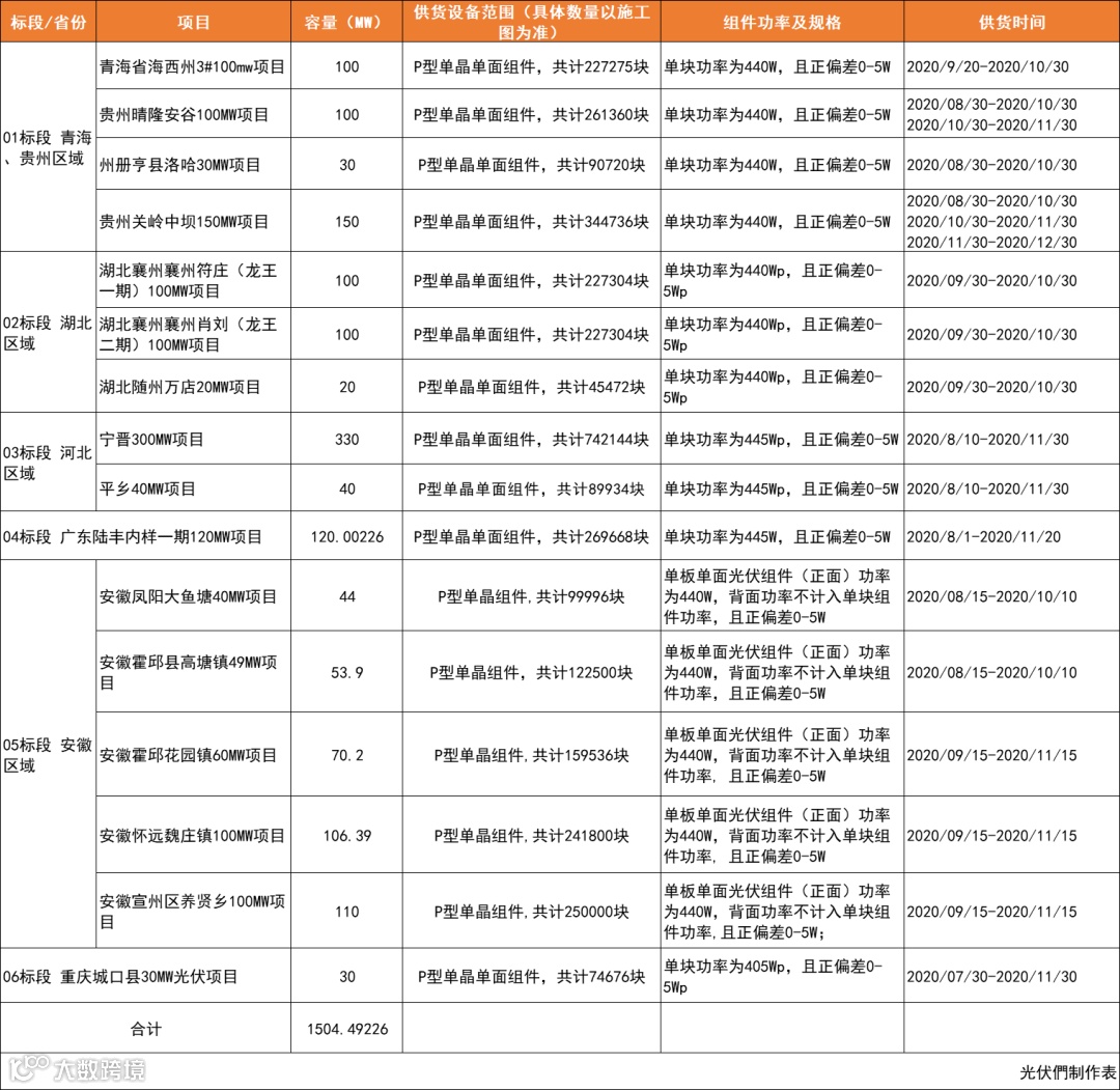 值得注意的是,此次招标组件均为P型单晶组件,组件单块功率范围均为440W、445W。光伏們汇总了各标段招标信息,如下图所示: