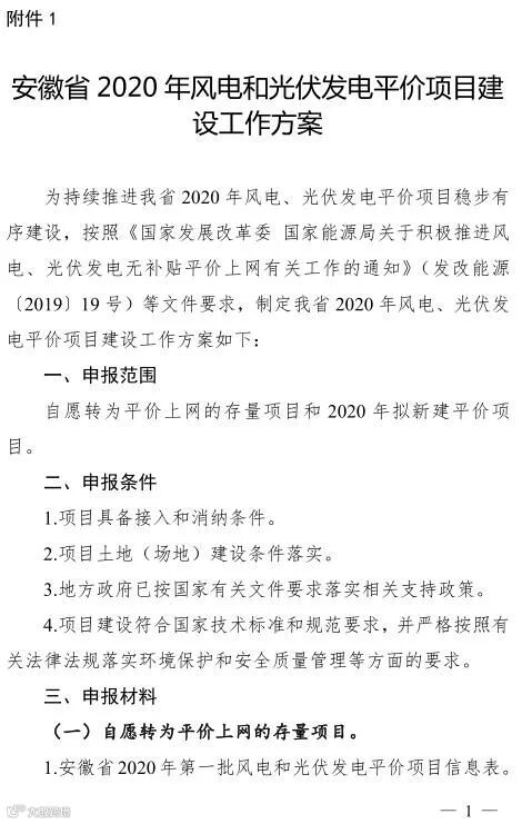 附件下载:附件1.安徽省2020年风电和光伏发电平价项目建设工作方案.doc