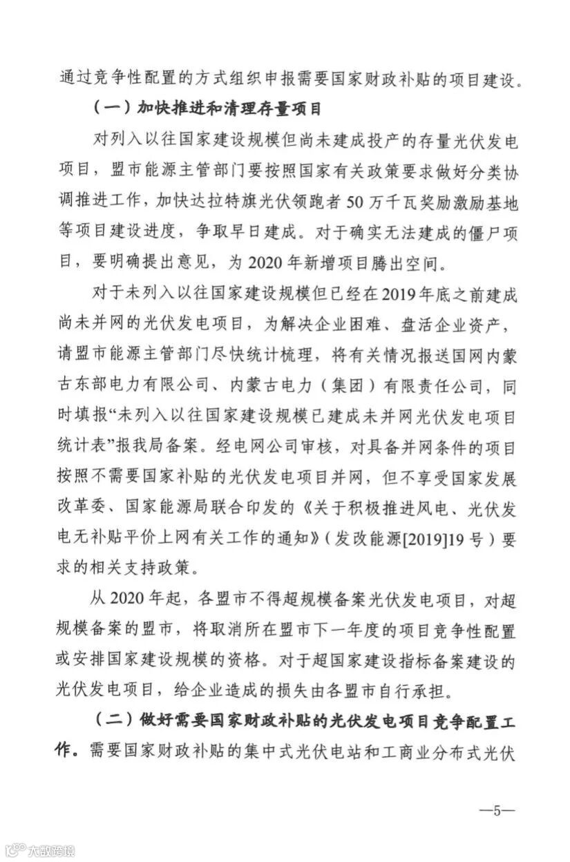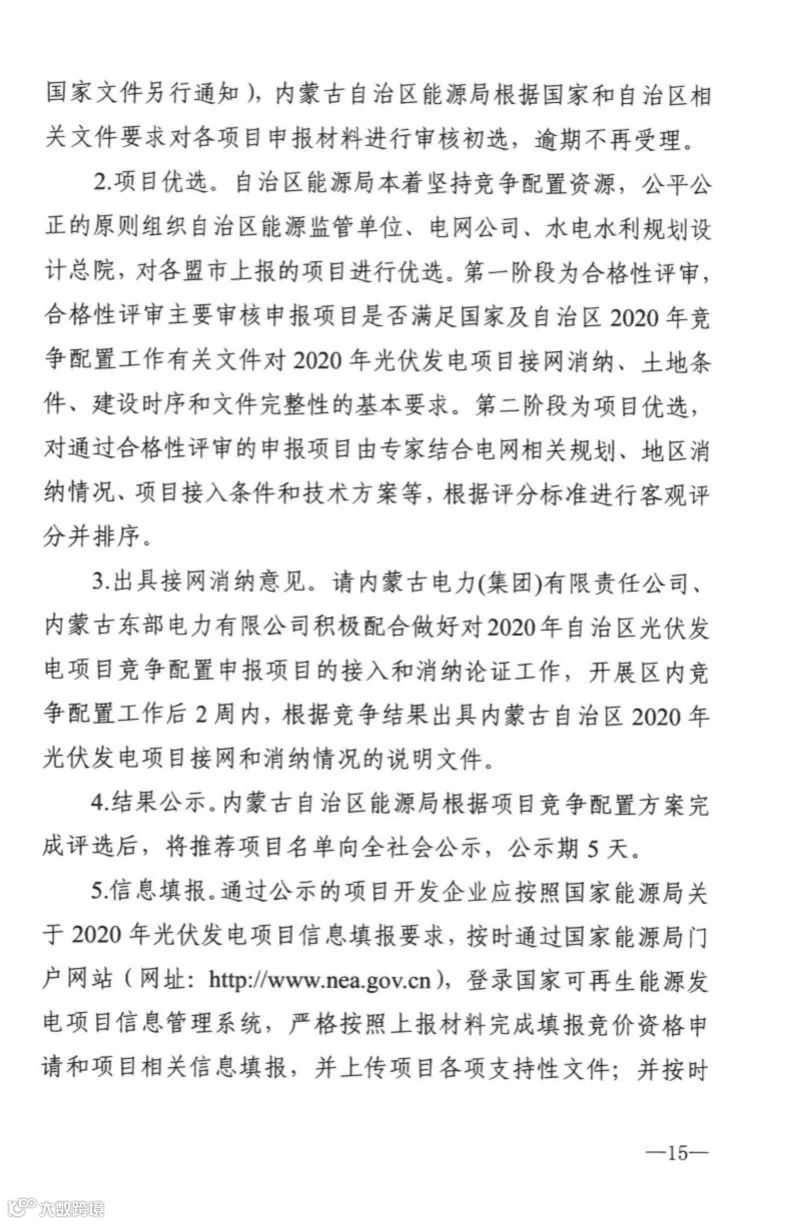4、2020年新增光伏发电消纳空间全部通过竞争性配置的方式申报需要补贴的项目建设。主要支持荒漠、采煤沉陷区(复垦区)、露天矿排土场。2020年光伏新增消纳空间共1.4GW,其中蒙西800MW、蒙东600MW。