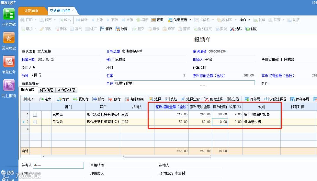 如果企业启用了预算管理或费用预算,员工报销时,在报销单表体录入对应预算项目,可以对以上报销费用进行预算执行控制。