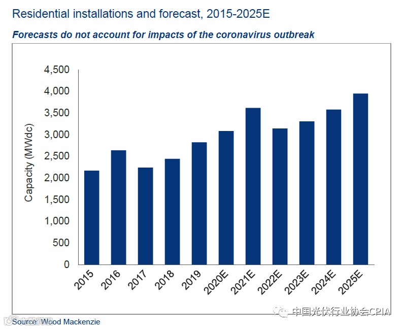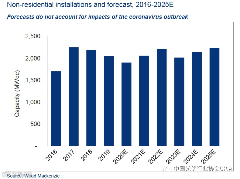 受州一级的政策改革和互联互通延误的影响,非住宅板块市场安装量继续下降。随着政策制定者和商业领袖越来越多地在决策过程中考虑储能,太阳能+储能能力的提高也将开始支持非住宅需求的增长。预计到2025年,大约30%的非住宅光伏发电容量将来自社区太阳能,并且预计每四个非住宅太阳能系统中将有一个安装储能。