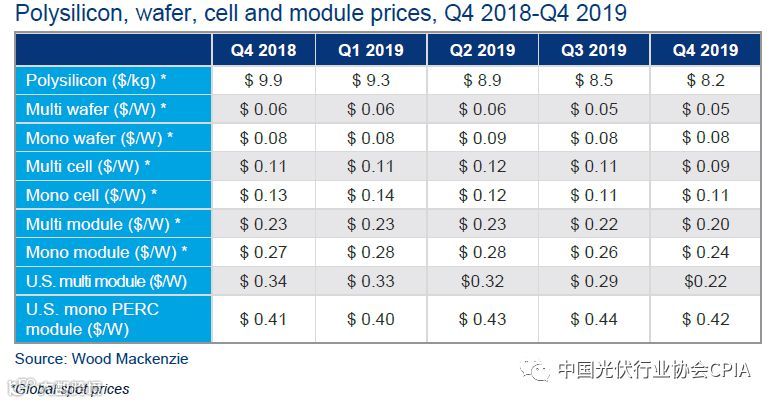 2019年第四季度,所有主要产品的全球现货市场价格均比上一季度有所下降。第四季度多晶硅价格下降了3.5%,导致单晶硅片和多晶硅片价格相应下降。多晶电池全球现货价格连续第二个季度下降,以应对全球对该产品需求的萎缩。类似的趋势适用于多晶组件。随着新的单晶电池产量在第四季度继续增加,其价格在2019年下半年保持稳定。不过,单晶组件价格在第四季度下降了2美分,这也反映了健康的供应水平。在美国,多晶组件价格在2019年第四季度跌至0.22瓦,这进一步证明了多晶组件在美国市场上已经过时了。单晶 PERC组件价格最终打破了2019年第四季度的价格上涨趋势,公用事业规模项目的价格下降了2美分至0.42美元/瓦。在2019年第四季度,由于国际贸易的担忧,双面组件的价格有所波动。