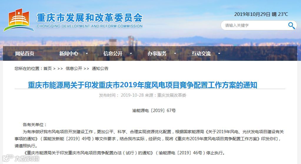 重庆市能源局10月28日发布《关于印发重庆市2019年度风电项目竞争配置工作方案的通知》,通知对项目配置、评分要求做了详细说明。规定配置规模总量不超过国家规划确定的该市年度建设规模,单个项目规模不超过10万千瓦(含)。每个区县报送项目数量原则上不超过2个。