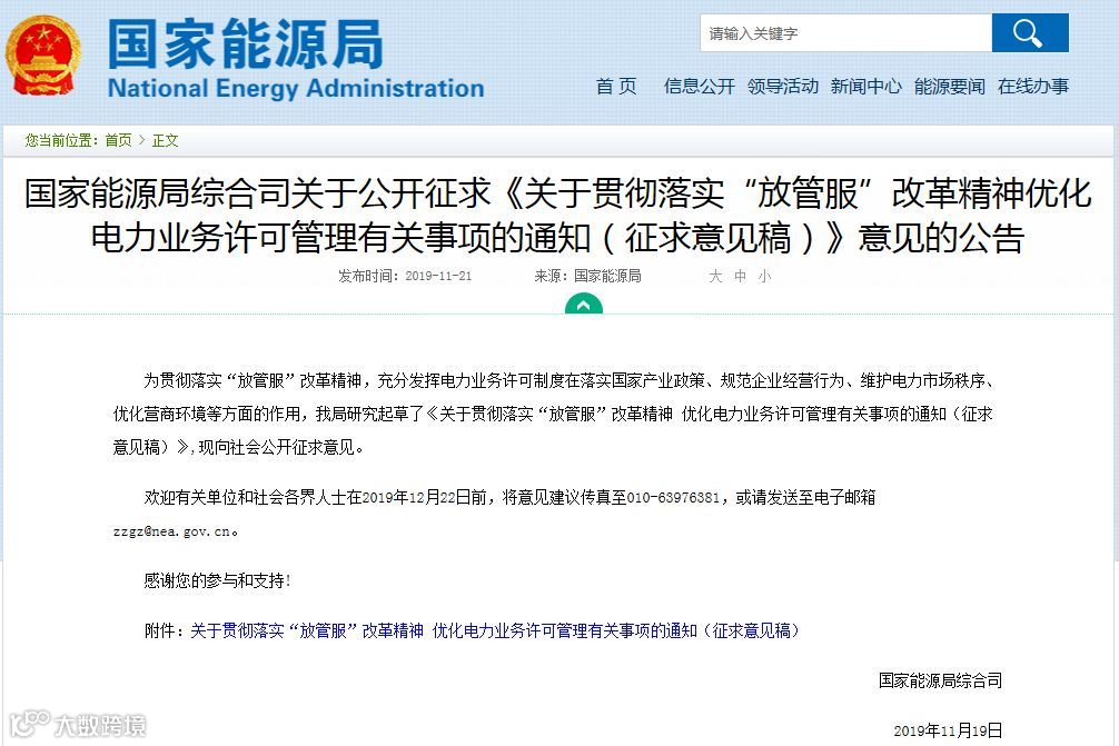 11月21日, 国家能源局官网下发《关于贯彻落实“放管服”改革精神优化电力业务许可管理有关事项的通知》(征求意见稿)。《通知》要求,项目装机容量6MW(不含)以下的太阳能、风能、生物质能、海洋能、地热能等新能源发电项目,不纳入电力业务许可管理,继续实施电力业务许可豁免政策。《通知》还称,经营太阳能、风能、生物质能(含垃圾发电)、海洋能、地热能等新能源发电业务的企业,简化发电类电力业务许可申请要求。